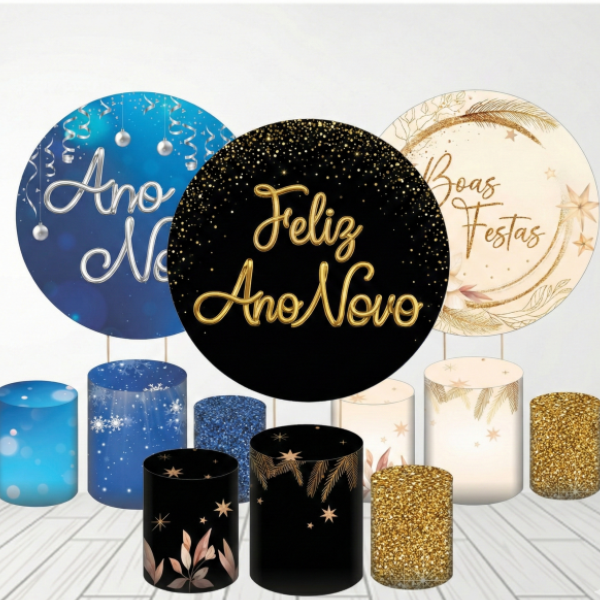 O Kit Festa ANO NOVO é composto por 1 capa para painel redondo e 3 capas para cilindros, nos tamanhos P, M e G. Esse kit traz uma nova forma de decorar, tornando sua festa única, divertida e ainda mais bonita.